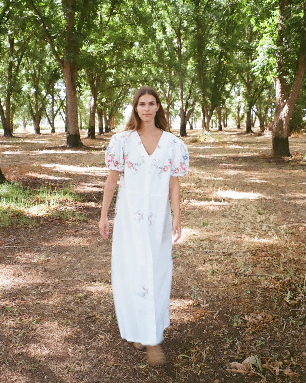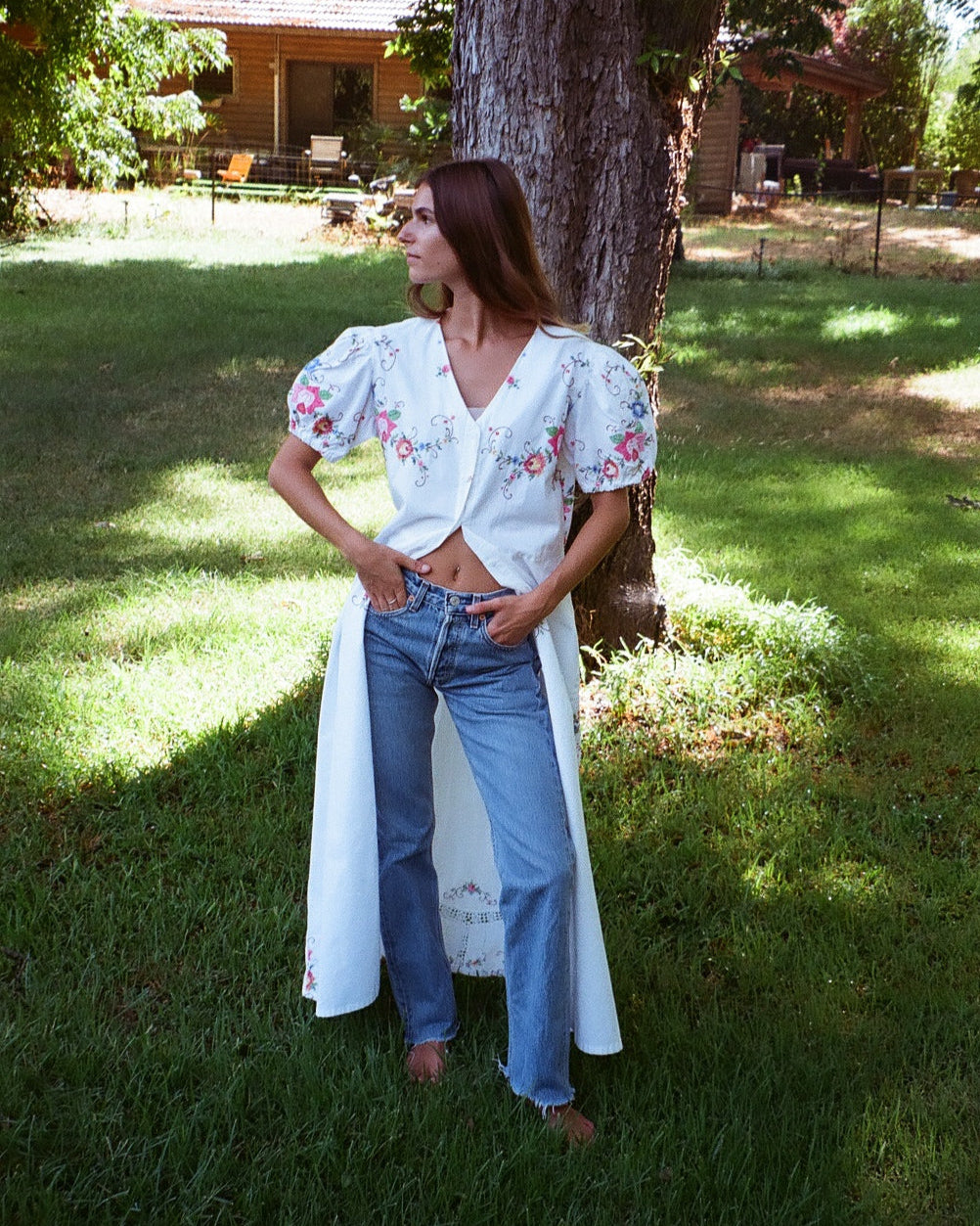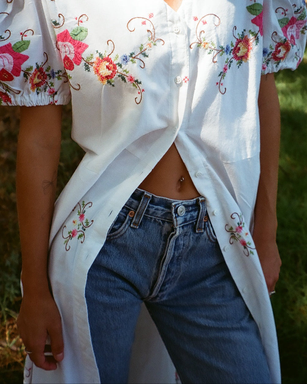 Crafted from vintage embroidered tablecloths, this one-of-a-kind dress blends timeless charm with a fresh summer silhouette. Featuring delicate floral hand embroidery, soft puff sleeves, and a button-down front, it offers both comfort and character. Each piece is unique, celebrating the beauty of craftsmanship and conscious design.